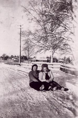 Estrid Rodas och Ella Enegren sittandes i snön på landsvägen utanför "Finnas" 1943.