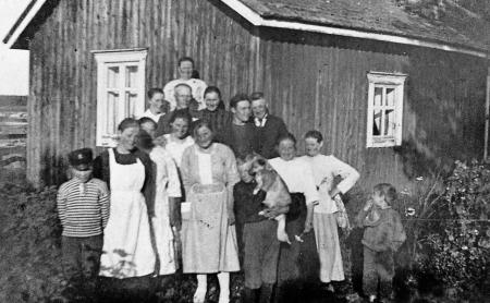 En sommarsöndag på Bolot 1924 med gäster. Främre raden fr. v. Arne Smeds f. 1911, Vivi Forth f. 1905, Elin Österholm f. 1909, Ellen Forth f. 1902, Gerda Enegren f. 1903, Robert Forth f. 1910, Rosa Forth f. 1903, Ulla Forth f. 1870 och Ensio Elfström f. 1916. Bakre raden från vänster: Sigrid Rosendahl som föddes år 1905, Einar Rosendahl som föddes år 1897, Sofia Alholm från Malax, Karl Uppgård som föddes år 1902, Herman Alholm från Malax som föddes år 1901. Överst på pyramiden Vendla Smeds som föddes år 1870.