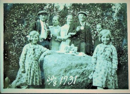 Fotografiet togs den 30 augusti 1931. På fotografiet syns tre kvinnor och två män, samt ett tvillingpar. I mitten av fotografiet har det dukats fram kaffe och dopp på en sten. Paret i mitten är Sigrid och Einar Rosendahl. De övriga okända.