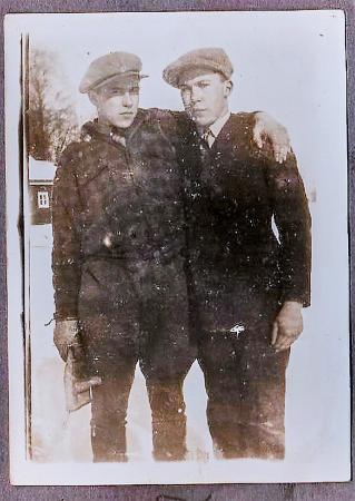 Till vänster står en man vid namn Birger, efternamnet saknas. Till höger Vilhelm Granholm, son till Axel Granholm. 1928 sålde Axel hemmanet på Näsbacken och köpte ett hemman i Karkmo och familjen flyttade dit,