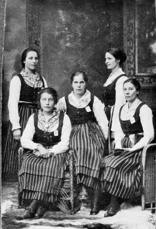 Ateljéfoto av fem Tölbyflickor, som är klädda i Korsholms folkdräkt med festmärken. Fotografiet är taget antingen år 1923 eller 1924.