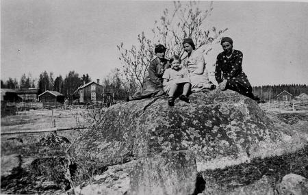 Från vänster på fotografiet sittande på en sten syns: Selma Stenström från Malax, som var tjänarinna hos Evert Påfs. Karin Påfs, född 1928. Aili Smeds, född 1911. Senny Smeds född 1909.