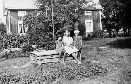 Från vänster: Britta Enegren, gift Bergström. Helga Ström, gift Dahlvik. Doris Enegren, gift Påhls. Paret Påhls rev stugan i bakgrunden 1976 och byggde en ny gård på samma gårdsplats.