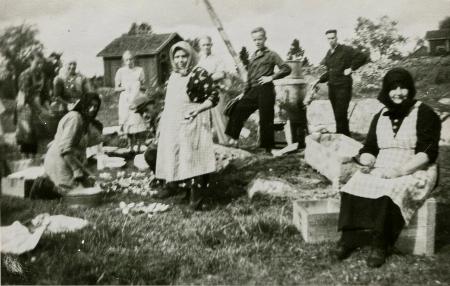 Sittande: Vendla Granholm "Lillsto-Venla" hade ansvar för potatiskokning vid bröllop och begravningar under lång tid av sin 96-åriga levnadstid. Potatiskokaren med rökrör mitt på bilden. Vendla Boijs stuga ses i bakgrunden till höger.