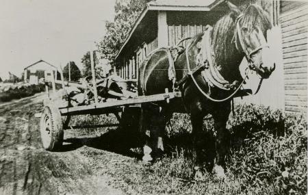 Folke Smeds häst Tjale spänd för långflakan med gummihjul på väg till vårjordbruket någon gång under slutet av 1950-talet. I bakgrunden synes gaveln av Tätting gård, som byggdes 1863-64.