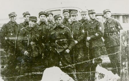 Fotografi av skyddskårister som är på en skjutövning i februari 1935.