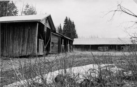 Sädesboden till vänster, de två lidren och stallet längst bort hitflyttad från det forna tomtstället inne i byn. Ladugården och foderladan av stock i bakgrunden har tidigare varit Erik Forths byggnader på Näsbacken, men blev inköpta på 1920-talet, då de gamla fähuset var uttjänt. Sonen i gården Alfred var då hemkommen från Amerika, men brodern Axel, även han dåtida emigrant återkom icke till hemgården från USA.