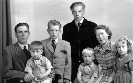 Sittande Runar med Tage i sin famn och Siri med Roland och Gunnevi. Stående storpojken Börje och till vänster om honom Kjell-Erik.