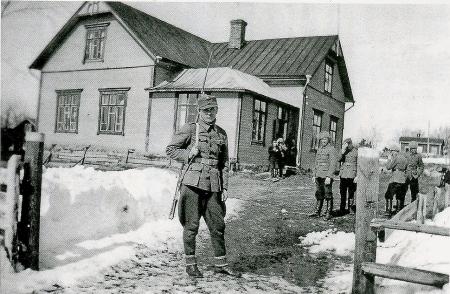 På fotografiet: Portvakt stående med bajonetten påsatt vid Tölby hembygdsförenings lokal, som användes för reservisternas inkvartering.