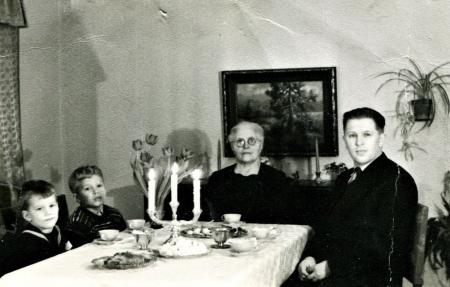 Bröderna Erik och Pehr-Göran. Vid bordsändan Emma Thölix f. Lervik i Sundom och till höger Torsten Thölix son till Emma och Erik Edvard Thölix. De båda pojkarna söner till Torsten.