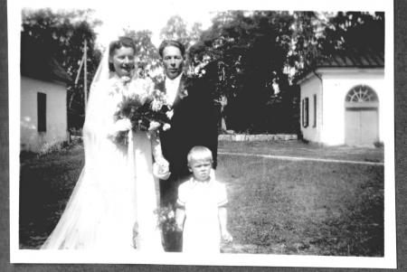 Ines och Evald Vesterlund gifte sej 1947 i Korsholms kyrka. Fotot taget utanför kyrkan med församlingshemmet till höger. Brudnäbben okänd.