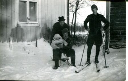Vid sparken Eric V Smeds, sittande Birger Påfs med Solveig Strand i Famnen, skidlöparen Eugen Forth. Solveig äldsta dotter till Karl-Gustav och Berit Strand. Berit född och uppvuxen vid "Paxal".