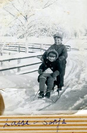 Ett vackert fotografi från vintern 1940 med Sonja sittande på sparken medan hennes farbror Lasse gentlemannamässigt skuffar på, båda med efternamnet Martin.