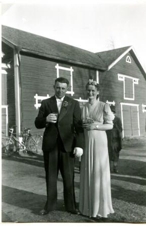 Emil son till Josefina och Johannes Rodas, Tölby med sin nyblivna hustru Anna-Liisa Toikkanen, hemma från den del av Karelen som avträddes till Ryssland 1944. Fotot taget vid Emils hemgård "Finnas" i Tölby.
