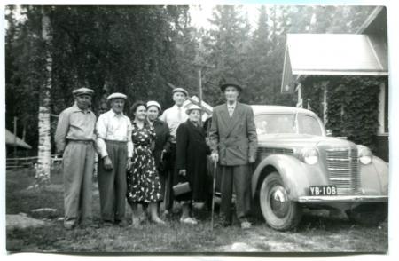 Från vänster: okänd, Edvin Boij med fru Ida, Lisa ?, Södergård bilägaren, okänd, Erik Boijer. Bilen en Moskvitch.